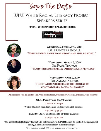 reflective opportunity for white people within the IUPUI community to unpack misconceptions and misinformation about structural racism. This semester we will host three expert speakers covering different discussion topics on February 6, March 6, and April 3. This series is open to faculty, staff, and students at IUPUI. For more information about each session and to RSVP, visit the White Racial Literacy Project